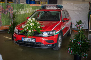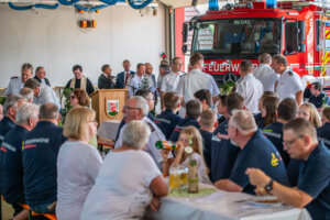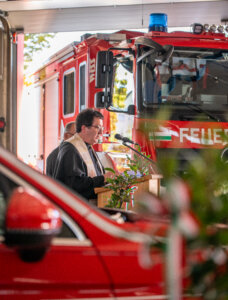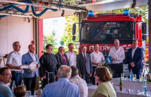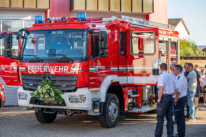 Bereits um 16 Uhr begann das Feuerwehrfest der Abteilung Walldürn mit der Segnung der beiden Einsatzfahrzeuge HLF 10 und des KdoWs. Nach einer kurzen Begrüßung der Ehrengäste durch den Abteilungskommandanten Nico Hartmann, segneten Pfarrer Kress von den evangelischen Kirche und Pater Josef Bregula von der katholischen Kirche gemeinsam die Fahrzeuge. Nach Grußworten von Feuerwehrkommandant Sascha Dörr, dem Stadtoberverwaltungsrates Helmut Hotzy und Bürgermeister Meikel Dörr, wünschten Kreisbrandmeister Jörg Kirschenlohr und Herr Keller vom Autohaus Gramling der Abteilung Walldürn mit den neuen Fahrzeugen allseits eine gute Heimkehr und ein schönes Fest.