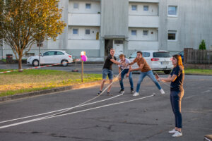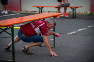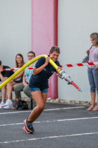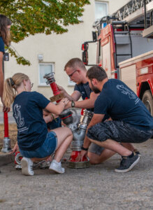 Am Sonntag startete das zweitägige Feuerwehrfest mit dem Frühschoppen und anschließenden Mittagessen. Gestärkt konnten dann vor allem die jüngsten Besucherinnen und Besucher die Spielstraße der Jugendfeuerwehr durchlaufen. Hier mussten die Kinder ihr Geschick beim Eierlauf mit einem Strahlrohr unter Beweis stellen, sich im Leitergolf beweisen, in einem kniffeligen Schraubenpuzzle ihre Fingerfertigkeiten unter Beweis stellen, ihre Zielgenauigkeit im Leinenbeutelwerfen und Schlauchkegeln beweisen und am Spritzehäußle ein fiktives Feuer löschen. Im Anschluss konnten sich die Kinder in der Hüpfburg der Jugendfeuerwehr austoben oder eine Rundfahrt in einem Feuerwehrauto erleben.