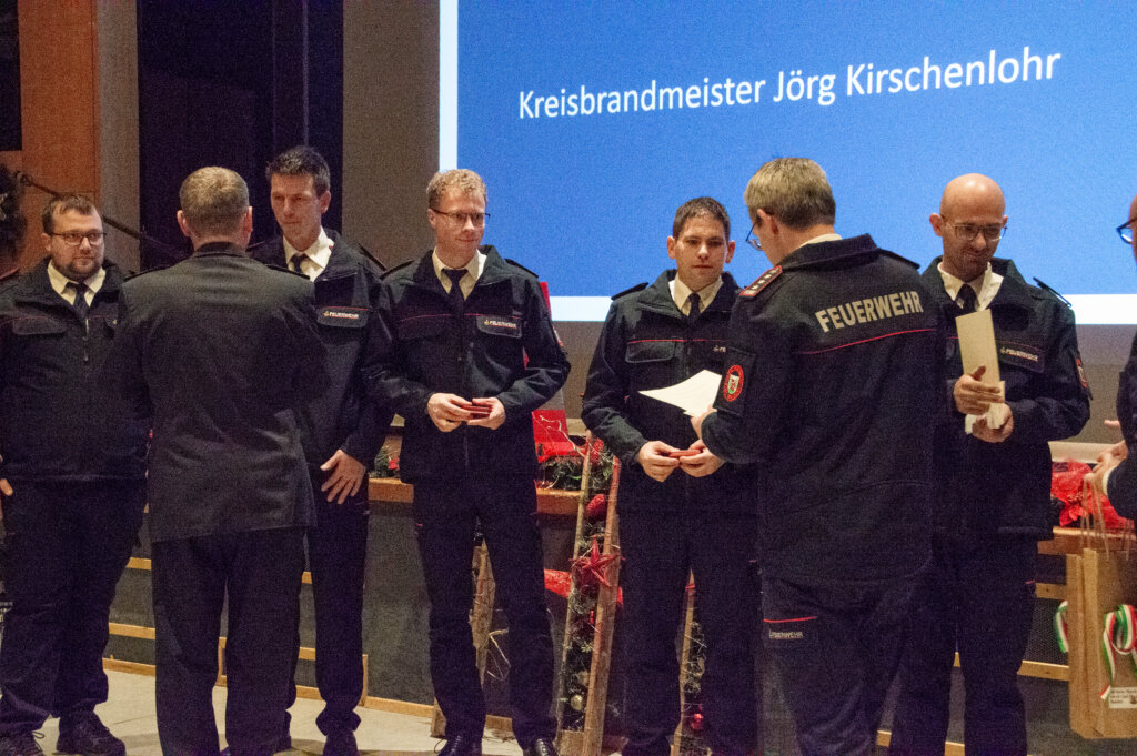 Im Mittelpunkt standen die Ehrungen durch Kreisbrandmeister Jörg Kirschenlohr, der Mitglieder für 15-, 25- und 40-jährige Dienstzeiten auszeichnete – ein beeindruckender Beweis für die Beständigkeit und Einsatzbereitschaft innerhalb der Wehr.