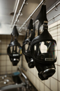 Bei einem Einsatz unter Atemschutz müssen sich die Feuerwehrleute zu 100% auf ihr Atemschutzgerät verlassen können – das eigene Leben hängt von diesem ab. Deshalb werden die Atemschutzgeräte in genau festgelegten Intervallen und nach jeder Benutzung in der Atemschutz-Werkstatt gereinigt, getestet und geprüft. Jährlich werden so ca. 1.600 Atemschutzgeräte und 500 Atemschutz-Masken gewartet. Auch das Befüllen der Atemluft-Flaschen erfolgt hier. Wie auch üblicherweise Tauchgeräte sind die Feuerwehr-Atemluftflaschen nicht mit Sauerstoff, sondern mit komprimierter Luft gefüllt.