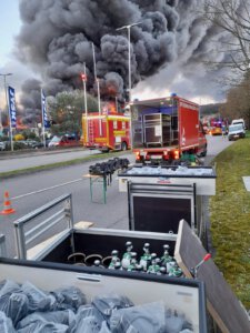 In diesem Fall werden über die Logistikkomponente Atemschutz mit unserem GW-T landkreisweit weitere Atemschutzgeräte, Ersatzluftflaschen und Atemschutzmasken zur Einsatzstelle gebracht.