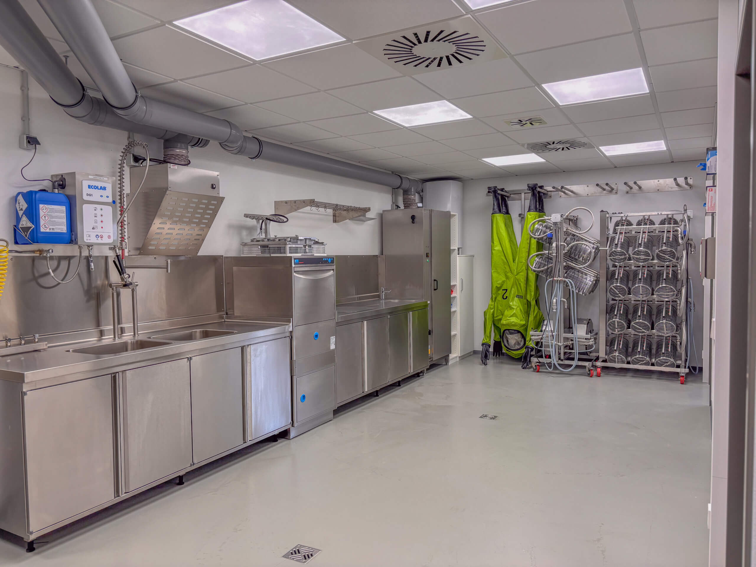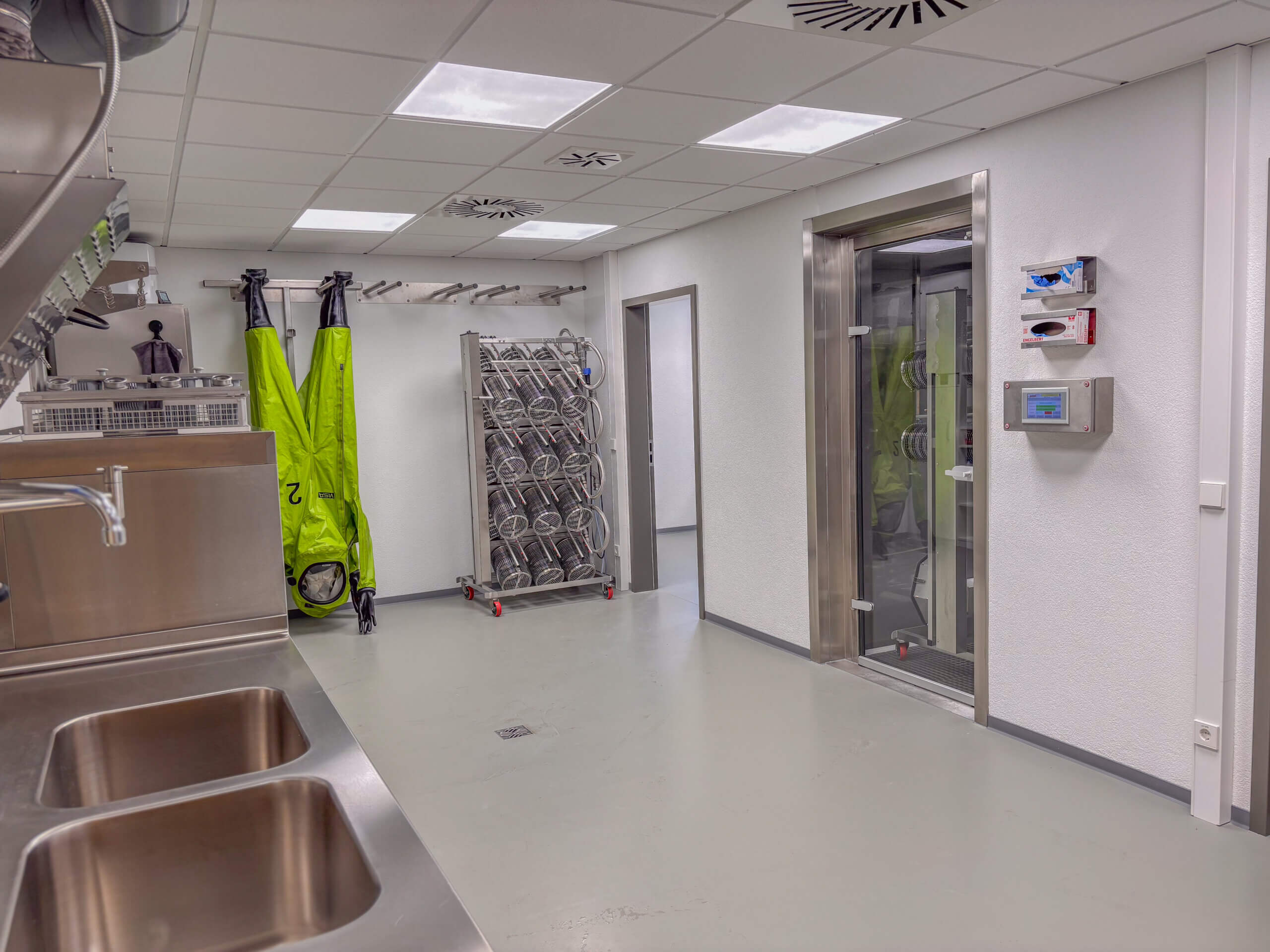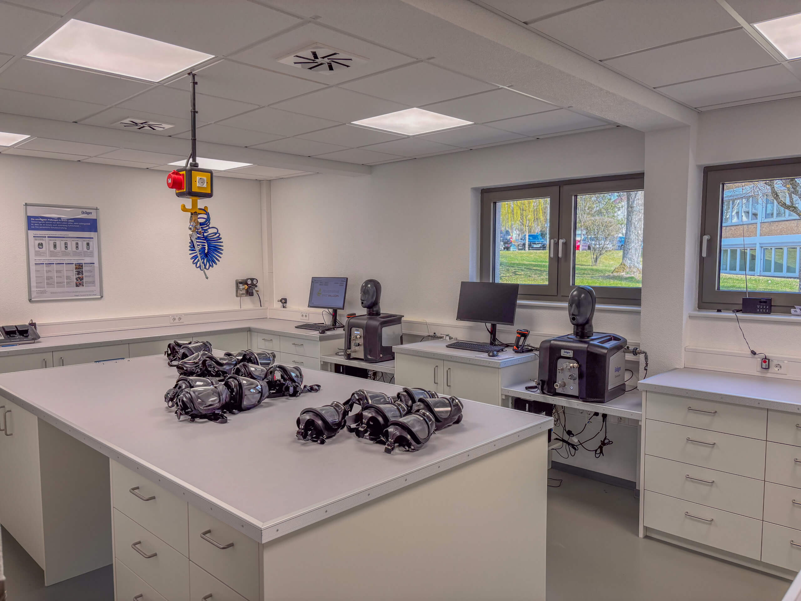 In der 2026 in Betrieb genommenen neuen Werkstatt, können die Kunden in einem separaten Bereich rund um die Uhr das kontaminierte Material abgeben. In einem definierten Ablauf mit strikter „Schwarz/Weißtrennung“ erfolgt dann die Reinigung, Aufbereitung und Prüfung der Atemschutzgeräte sowie der Einsatzkleidung.